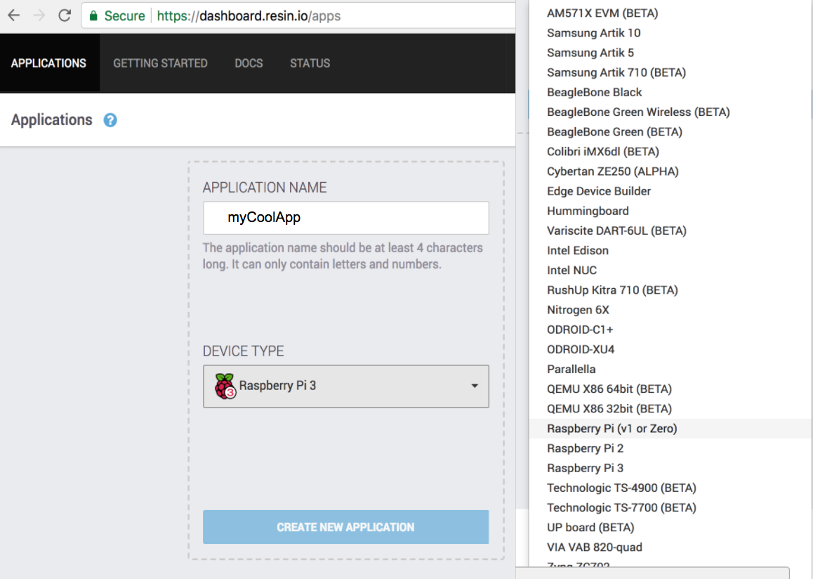 Next create your application, give it a name and pick your device type from the list.
